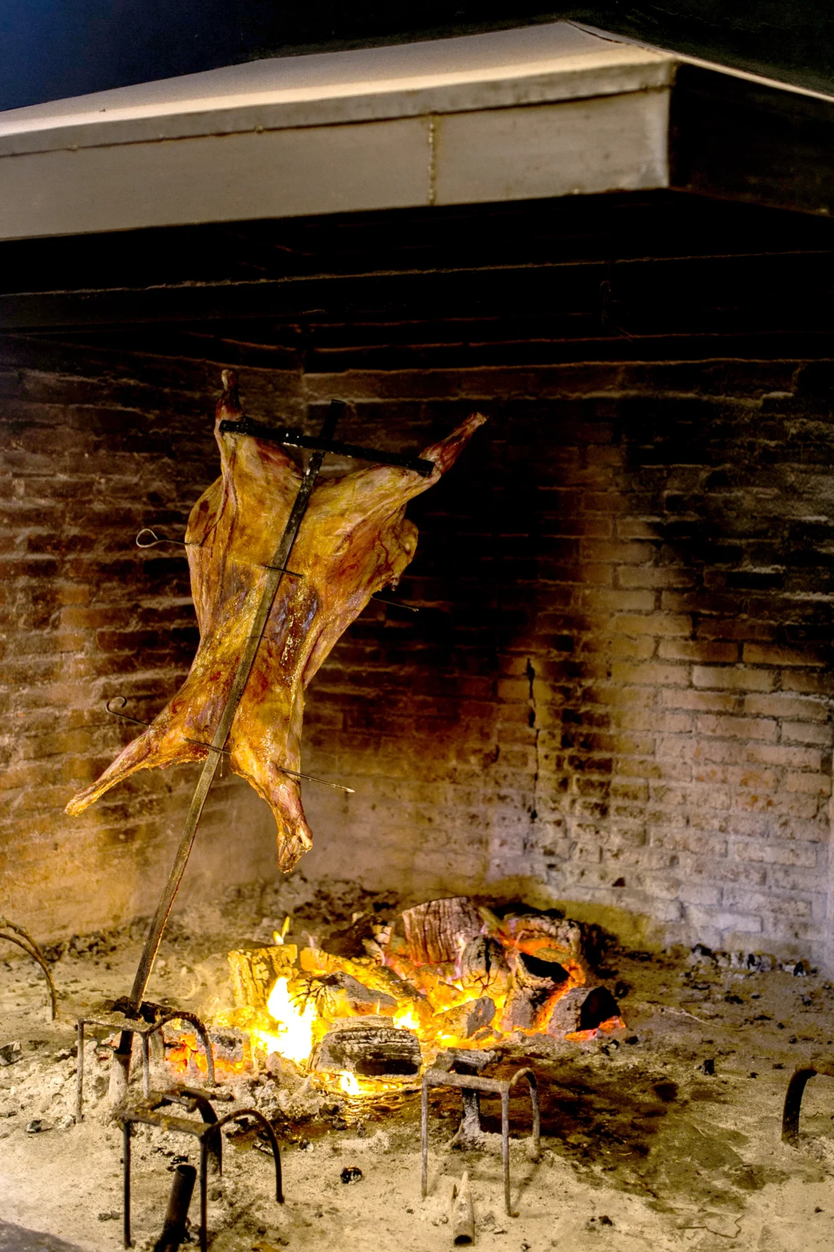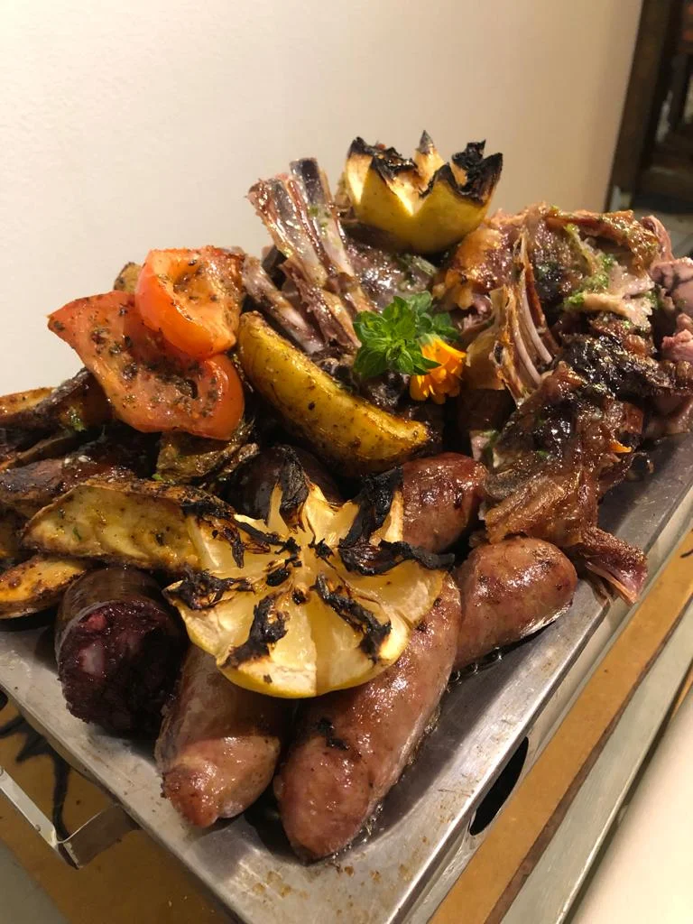 Cordero al Asador, Pollo, Chorizo, Morcilla: Plato principal con carnes asadas, papas rústicas y ensaladas.